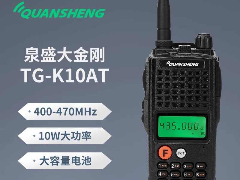 • K10AT 泉盛大金刚是高性价比模拟对讲机,覆盖 136-174/400-470MHz 双频段,10W 大功率搭配 100 信道,通讯距离更远。4000mAh 锂电池续航强劲,支持一键对频与手电筒功能,耐 - 25~+65℃环境,操作简单抗干扰,适配户外、自驾、工地等场景。...